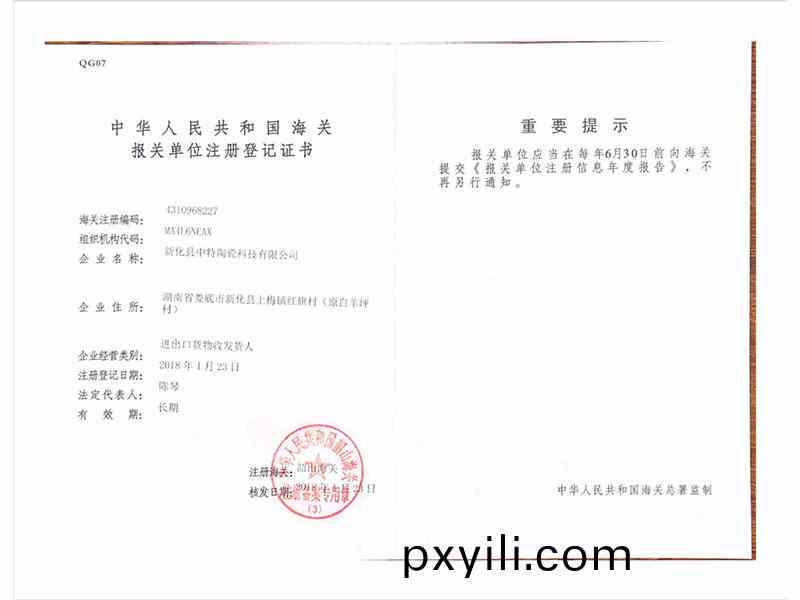 海關(guan)註(zhu)冊登(deng)記證(zheng)書